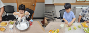 - 7월 29일(목)부터 시작된 ‘쿠킹교실’ 프로그램이 8월 28일(금)에 마무리되었습니다. 총 10회기 동안 쿠키, 타르트, 송편, 케이크 등 다양한 활동을 진행했습니다. 아이들은 직접 생크림을 만들어보고, 강사와 보호자의 지도 아래 플라스틱 칼로 과일을 손질하는 경험도 했습니다. 이 과정에서 보호자와 아동이 함께 상호작용하며 정서적으로 성장할 수 있는 뜻깊은 시간이었습니다. ■ 문의 : 차채은 사회복지사 (☎336-7007~8)