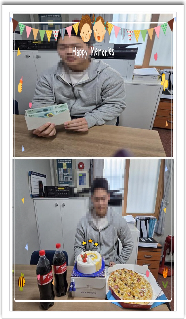 - 미네르바의 집에서는 2025년 12월 27일 토요일 15시부터 16시 20분 까지, 2025년도 하반기 제3차(12월) 생일 대상자에 대한 생일축하프로그램을 실시하였습니다. 올해 마지막으로 실시된 생일축하프로그램은 이*경(12/18) 1명의 대상자로 진행하였으며 근로 시간과 개인 일정으로 인해 토요일에 약식으로 프로그램이 실시되었습니다. 성대한 파티로 축하를 할 수는 없었으나 늦게나마 생일 케잌과 피자 등 간식을 지급하는 것으로 소중한 생일의 의미를 담아 전달하였고 다행히 만족스런 결과를 얻게 되어 보람 된 시간이었습니다. 남은 올해 마무리 잘하고 내년에도 열심히 정진할 수 있는 따뜻한 응원이 되었기를 기대해 봅니다.